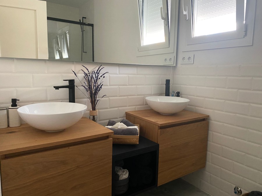 En los baños, hemos optado por crear espacios completos y funcionales. En el baño de invitados, hemos utilizado azulejos estilo "metro" que le confieren un aspecto moderno y atemporal. Además, decidimos instalar una bañera y dos muebles extactamente iguales para dar sensación de uniformidad y organización.